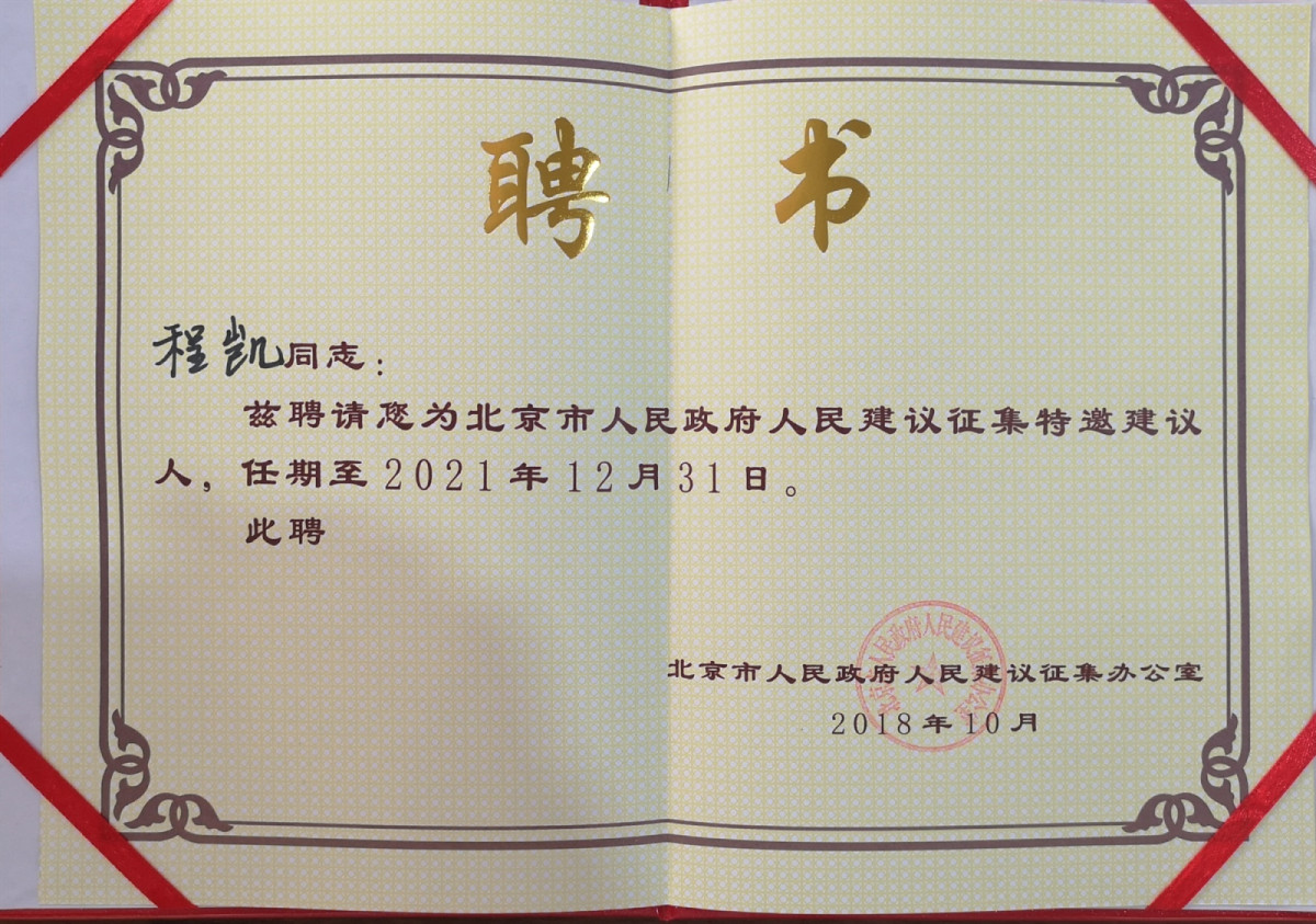 2018年11月上旬,北京市人民政府人民建议征集办公室举办了特邀建议人培训班,对特邀建议人进行专门培训,程凯同志参加培训。