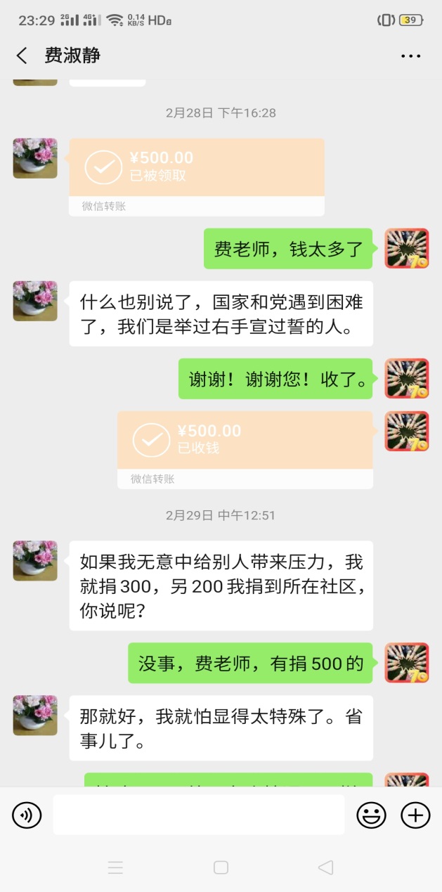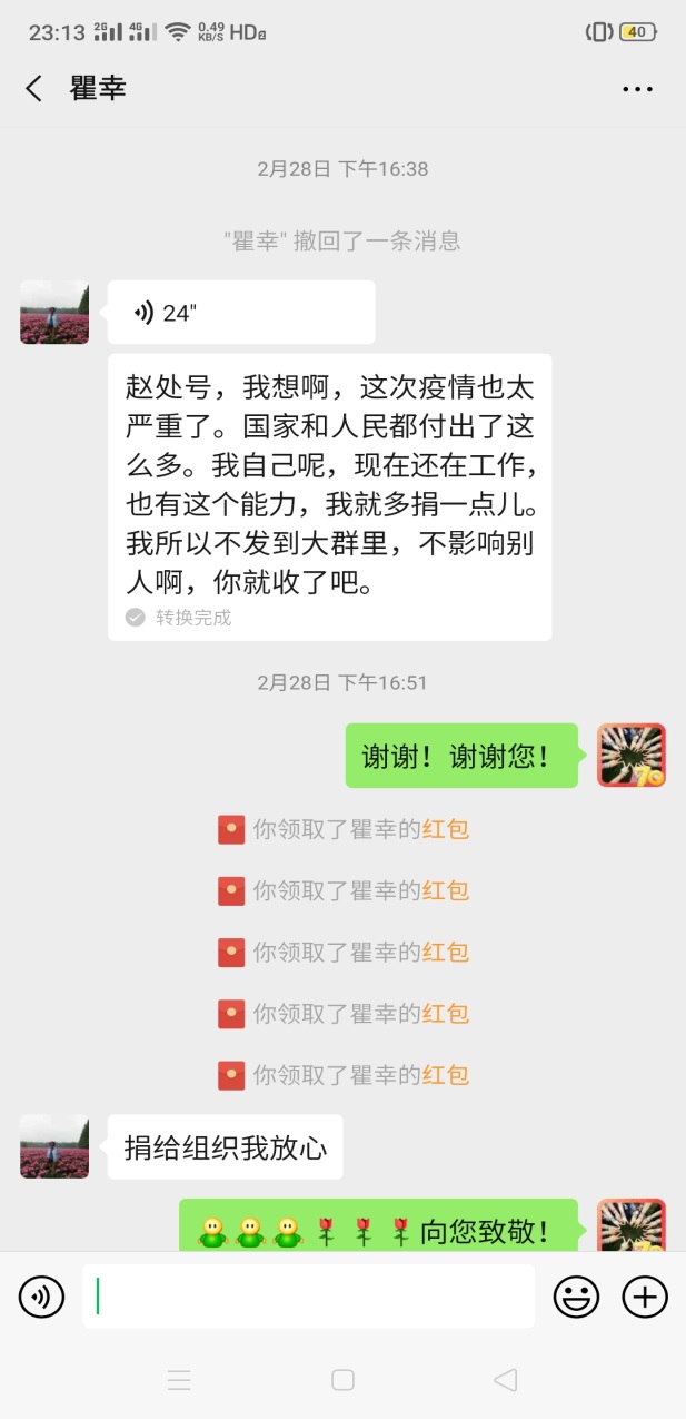 瞿幸老师说:“我想啊,这次疫情也太严重了,国家和人民都付出了这么多,我自己现在还在工作,也有这个能力,我就多捐一点,我不发到大群里,不影响别人,你就收了吧”。