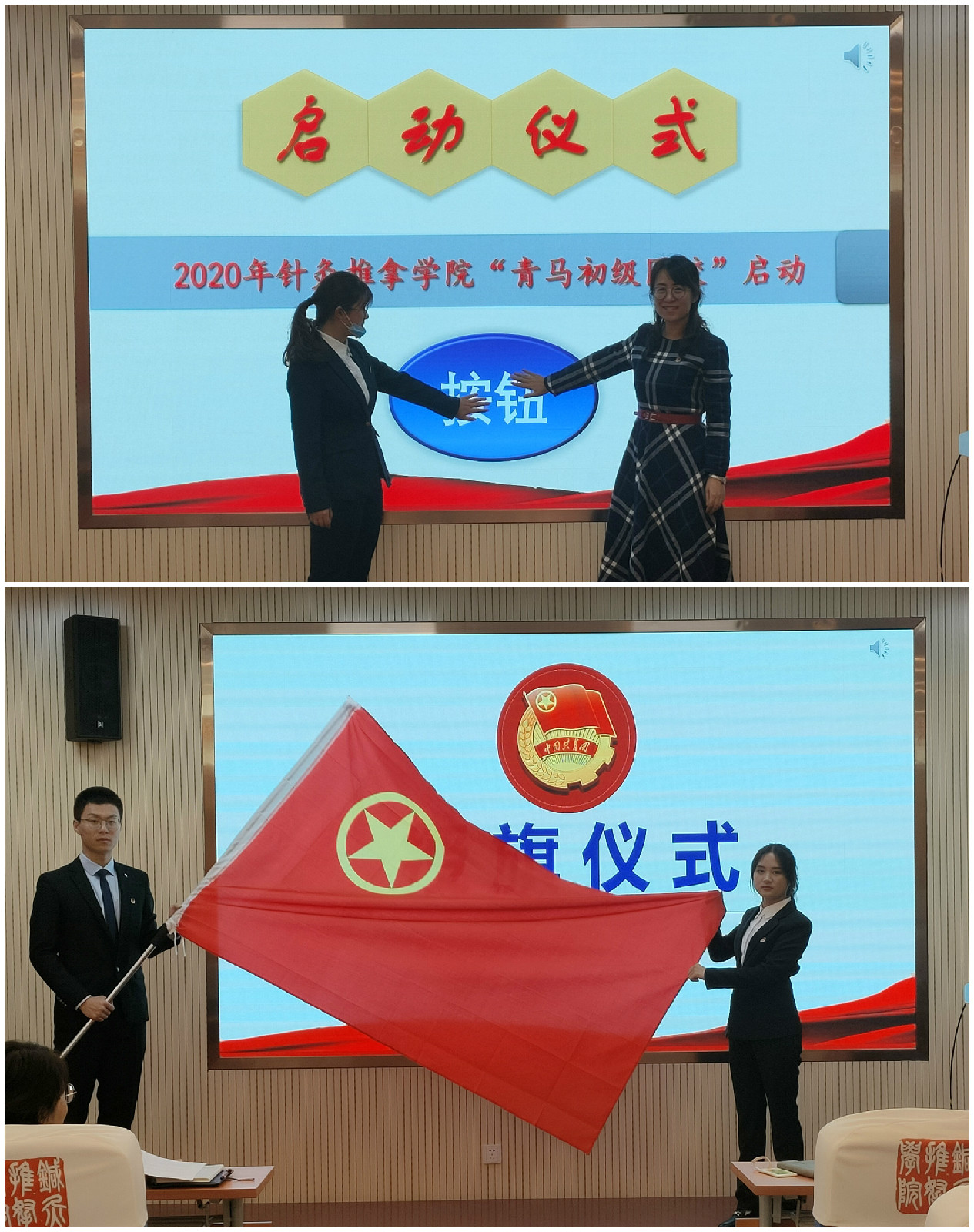 启动仪式上,院党委副书记陈静漪与本届青马学院代表、来自2019级针灸推拿学五年制02班的张安然同学共同开启了针灸推拿学院2020年“青马初级团校”启动按钮;随后,陈静漪副书记向学员代表发放了团课学习的相关书籍、文具、团徽及团章等物资。上一届青马学员代表、来自2018级卓越针推八年制的张庆临同学向新生学员代表曾铉玲同学授予团旗,标志着针道薪火的代代相传与青马扬帆的再度启航。
