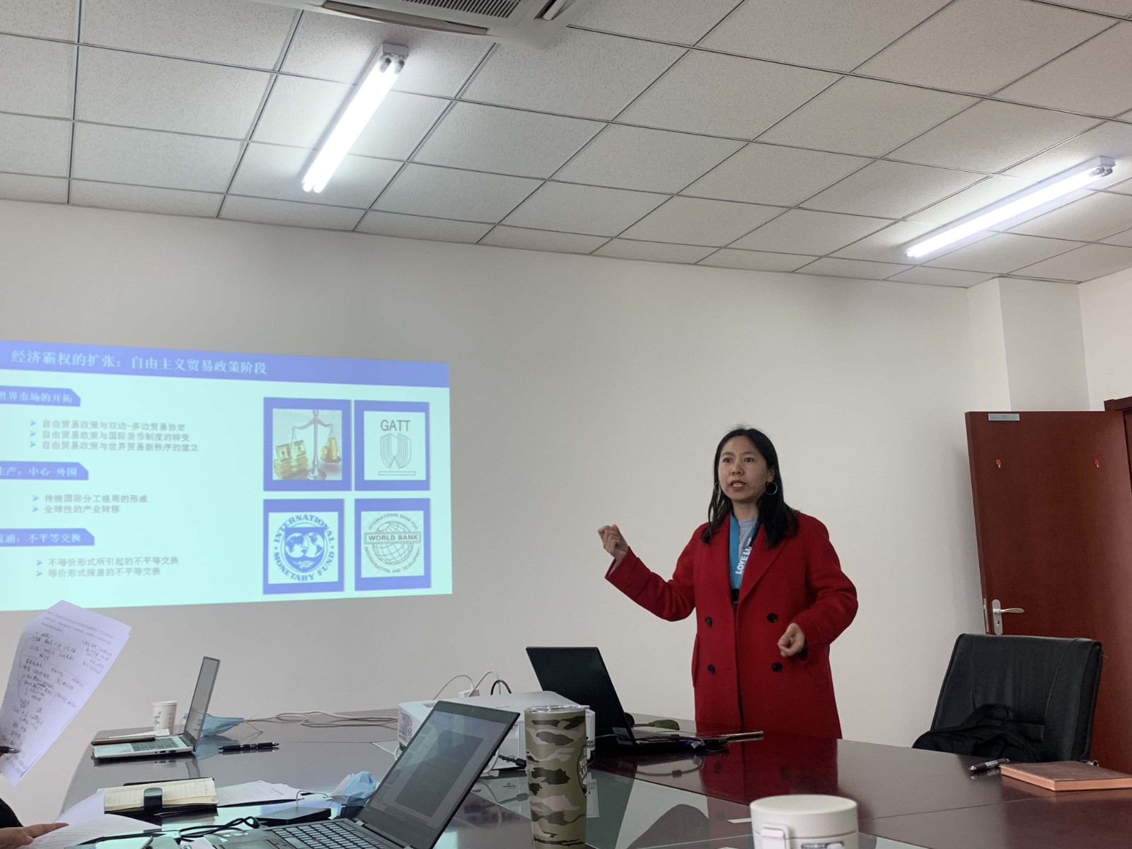 第一期交流主题为“资本逻辑视域下美国国际贸易政策变迁”,从劳工对国际贸易政策制定的影响、资本-资本的博弈、国家-国家的博弈三个层次探讨了美国国际贸易政策的政治决定过程。汇报结束后,老师们进行了交流互动。