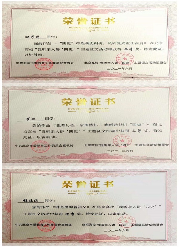 我校学生在北京高校“我听亲人讲‘四史’”主题征文活动中喜获佳绩