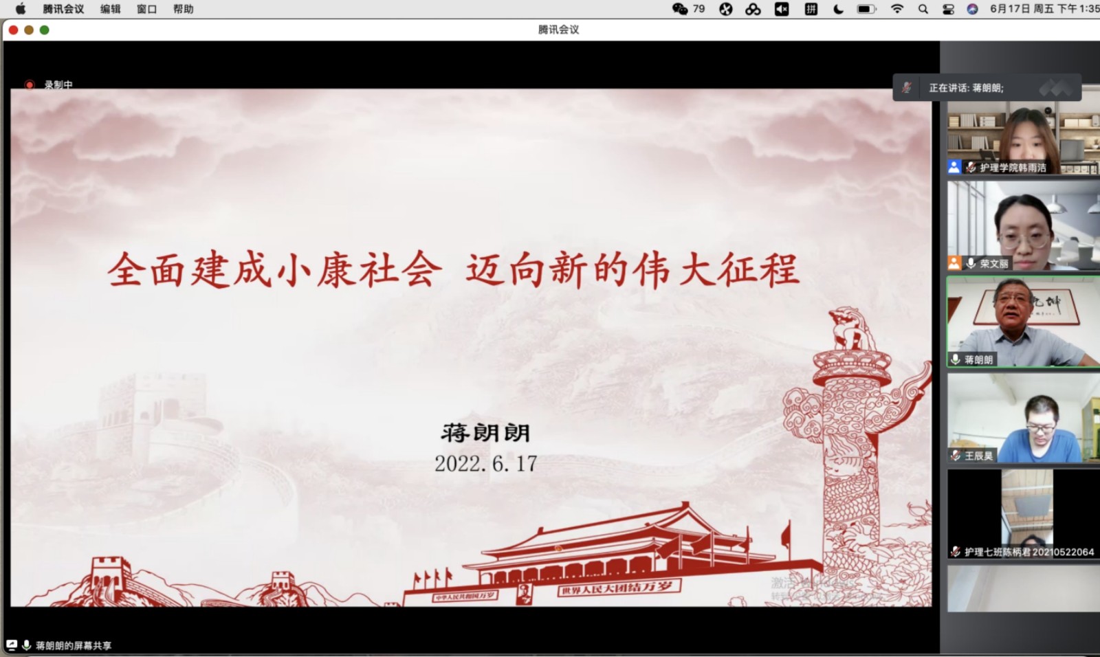 6月17日,我校党委副书记、纪委书记蒋朗朗走进《中国近现代史纲要》线上课堂,以《全面建成小康社会 迈向新的伟大征程》为题,为2022级护理(二本)7班、8班本科生讲授思想政治理论课。
