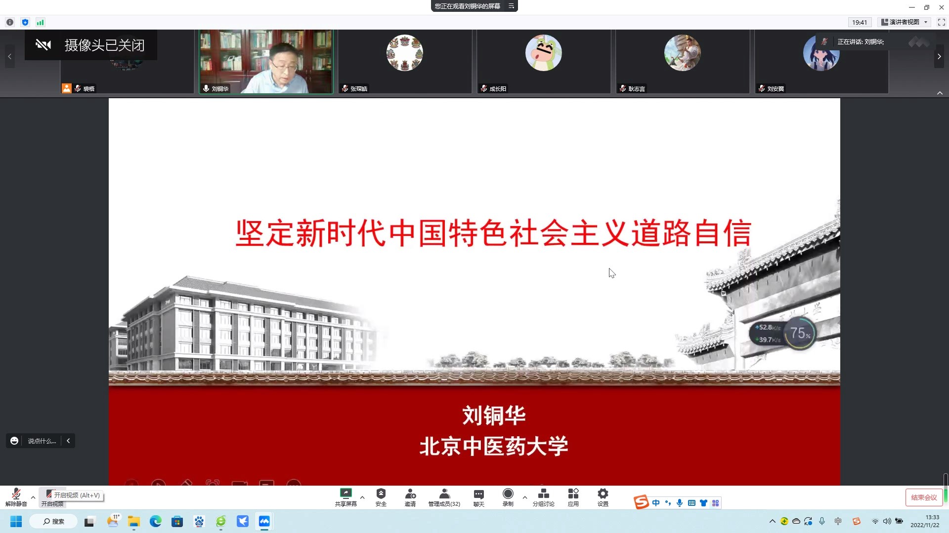 11月22日下午,我校副校长刘铜华教授走进线上思政课堂,以“坚定新时代中国特色社会主义道路自信”为主题,为2021级华佗班讲授“马克思主义原理”课程。
