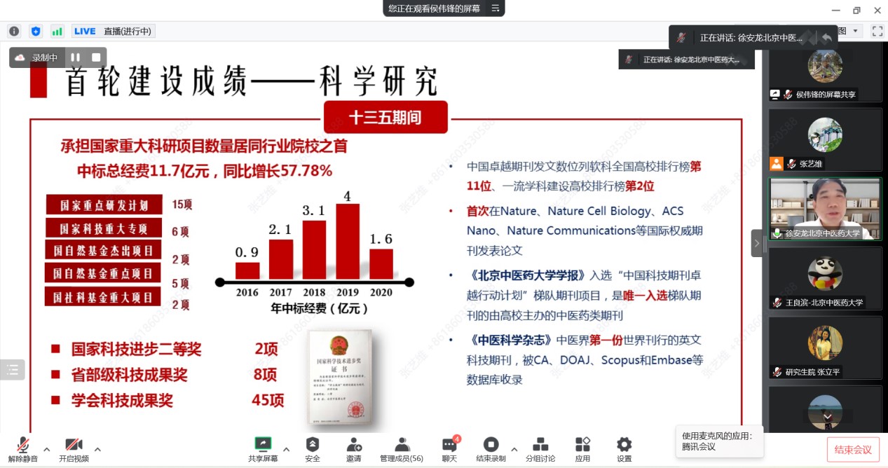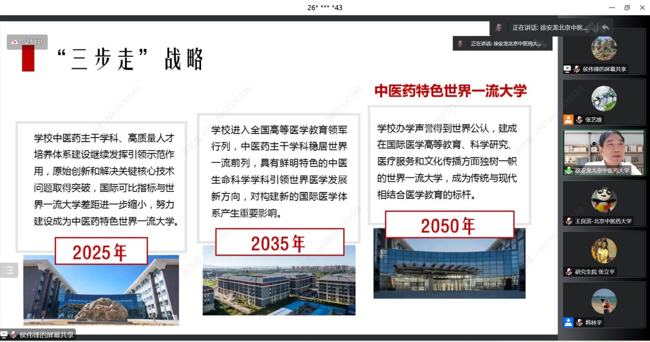 随后,徐校长重点讲述了我校“双一流”建设工作。他指出北中医是我国高等中医药院校领头雁,“双一流”入选学科位居全国中医药院校之首,北中医建设“双一流”的目标是建设具有中国特色、中医药特色的世界一流大学。徐校长结合北中医发展定位以及个人海外经历,阐述了我校擘画“双一流”建设“三步走”战略的宏伟蓝图。他介绍了首轮“双一流”建设过程中,北中医在人才培养、师资队伍等众多领域取得的成绩以及存在的不足。
