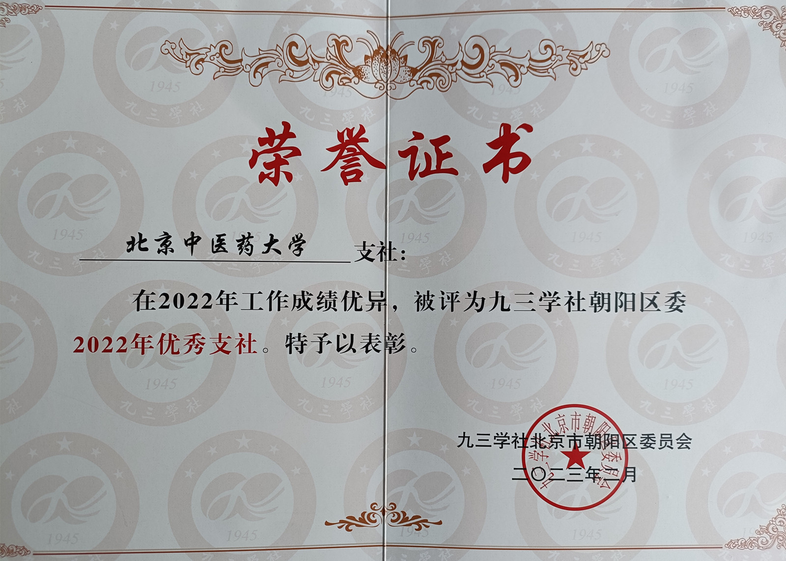 我校九三支社获评九三学社朝阳区委2022年度优秀支社