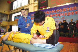 “阳陵泉,足少阳胆经穴,位于小腿外侧,腓骨头前下方凹陷处……”选手一边作答,一边在模特身上准确取穴,并作记号。在中医针灸成功申遗之际,