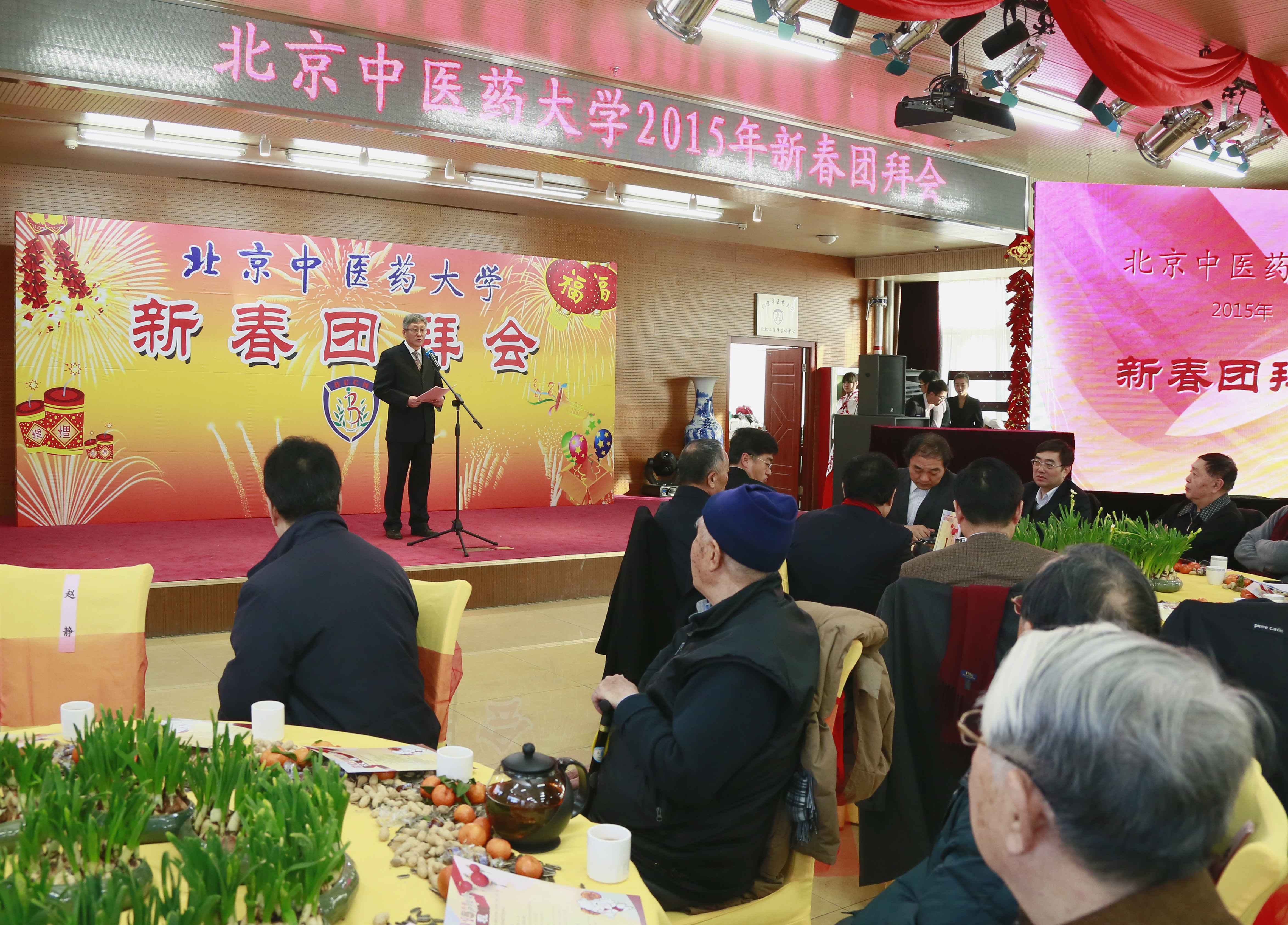 教职工代表、第十届北京市教学名师、基础医学院李峰教授,校友代表、世界中医药学会联合会常务副主席兼秘书长李振吉,合作单位代表、红日药业有限公司总经理吴玢分别发言。他们在发言中回顾了过去一年来的收获和思考,表达了作为北中医人的自豪,充满信心地展望了2015年的使命和征程。