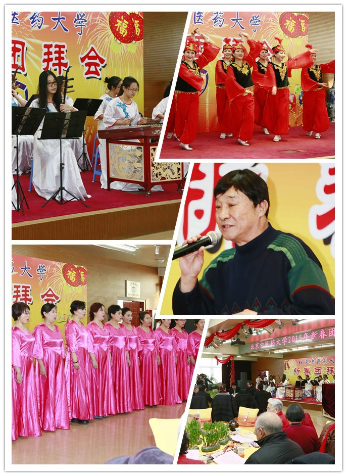 团拜会现场大屏幕同步播放了我校2014年度十大新闻事件。大学生民乐团、离退休老同志及教工合唱团为大家表演了民乐演奏、评剧、舞蹈、小合唱等节目,表达了广大北中医师生喜迎新春、展望未来的美好心情。