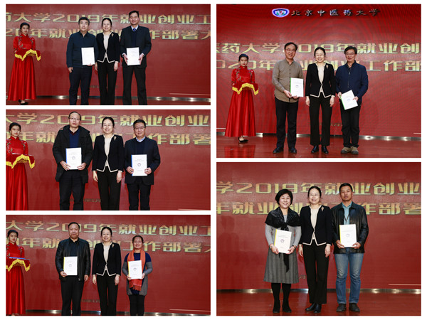 会上,学校对在2019年度就业创业工作中做出突出贡献的集体和个人进行了表彰。中药学院、第一临床医学院、生命科学学院、第三临床医学院荣获2019年度就业创业先进单位并成为首批“专创融合项目”建设单位;中医学院、护理学院、针灸推拿学院、研究生院荣获2019年度就业先进单位;第二临床医学院、管理学院、人文学院荣获2019年度就业进步奖;广安门医院、西苑医院、北京中医医院、望京医院、中日友好医院荣获2019年度就业特别贡献奖。雷海民等8人荣获创新创业工作突出贡献奖;王林元等17人荣获创新创业工作优秀指导老师;任小巧等46人荣获就业工作先进个人。校领导为获奖单位和教师代表分别颁奖。