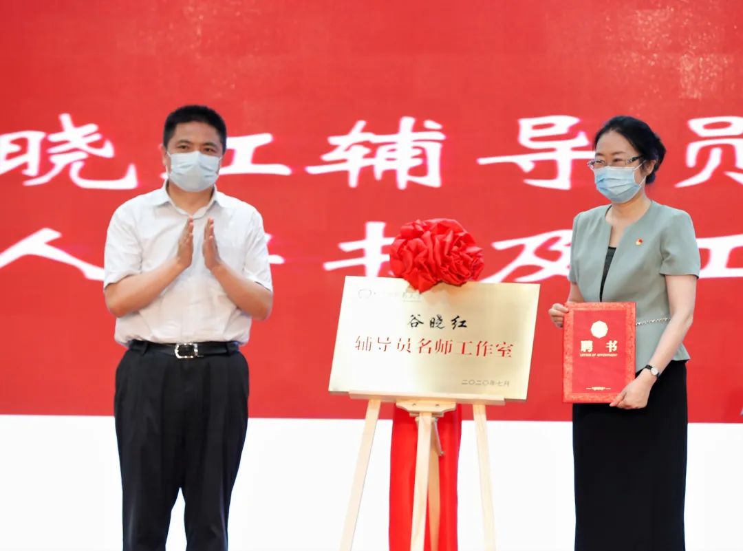 学工部部长李玮宣读了辅导员名师工作室领衔人名单,北京市委教育工委副书记狄涛、北京市委教育工委宣教处处长寇洪江分别为谷晓红、张继旺颁发辅导员名师工作室领衔人聘书并与领衔人共同为工作室揭牌。