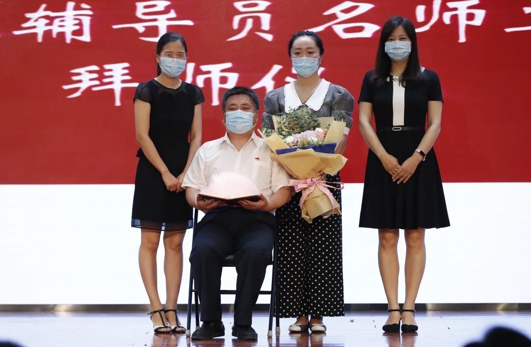 拜师环节,辅导员名师工作室成员向导师鞠躬、敬茶、献花、赠送“树灯”,表达对导师的敬意,并与导师合影留念。
