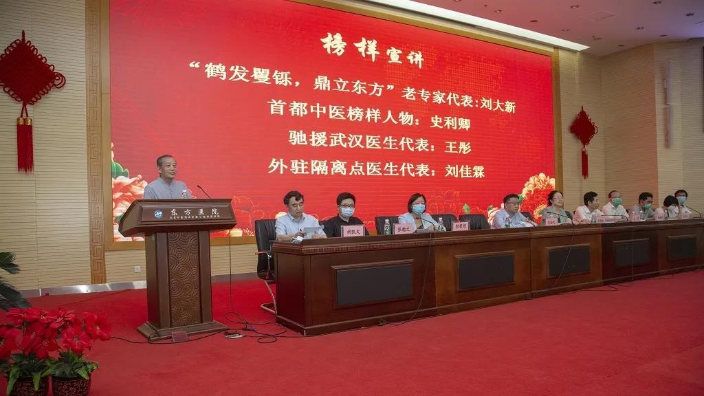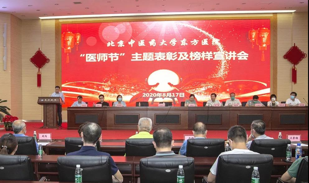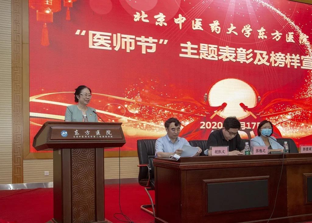 8月17日下午,第二临床医学院(东方医院)举行第三届“医师节”主题表彰及榜样宣讲会。谷晓红书记、王伟副校长参加了表彰活动并慰问了一线医师代表。会上对医院“最美防控先锋队”“复工复产先进典范”“三突出”科室代表、首都榜样和抗疫逆行者进行了表彰,并特设“鹤发矍铄,鼎立东方”奖,以感谢老专家们鼎力支持医院疫情之下的复工复产工作。表彰大会上还分别邀请“鹤发矍铄,鼎立东方”奖代表刘大新、首都中医榜样人物代表史利卿、驰援武汉的医生代表王彤、外驻隔离点医生代表刘佳霖作榜样演讲。谷晓红书记向东方医院全体医师致以节日的问候,向疫情发生以来坚守在一线的医护人员、奔赴武汉的国家中医医疗队成员以及守护在医院的广大职工致以崇高的敬意和衷心的感谢。表彰大会后,校领导与东方医院一线医务工作者代表们进行了座谈。