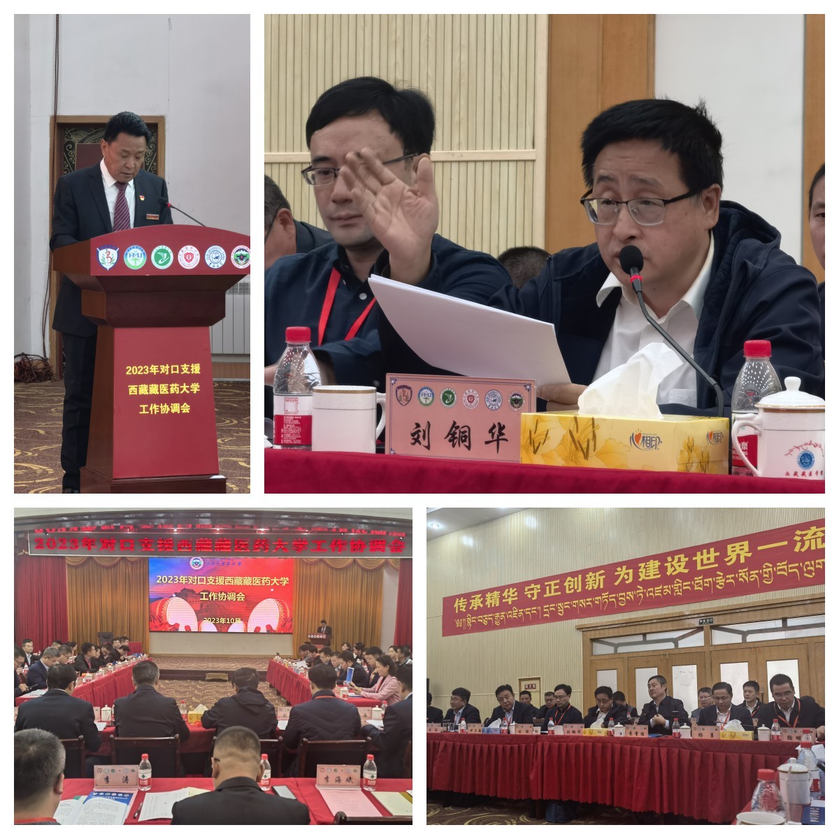 10月9日至11日,2023年度对口援藏工作会议在西藏藏医药大学举办。会议由我校主办,西藏藏医药大学承办,哈尔滨医科大学、江西中医药大学、中国药科大学、吉林大学等援藏高校参会。会议由西藏藏医药大学党委副书记、校长米玛主持,我校副校长刘铜华、哈尔滨医科大学党委常委、地病中心党委书记袁重胜,江西中医药大学副校长刘潜、中国药科大学副校长杨勇、吉林大学医学部副部长伊大海及相关部门负责同志参加会议。