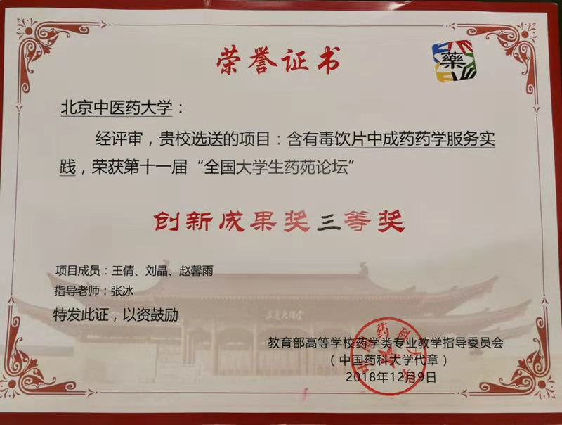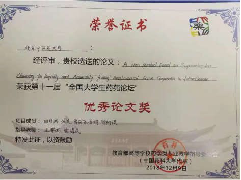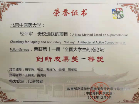 本次比赛分药剂学、中药学、生化药学等7个领域,分壁报交流、论文评选、现场答辩三个比赛环节,最终经过激烈角逐,我校中药学院中药学专业(卓越中药班)和药学班本科生田学浩、张昊、曹晓飞以参赛作品“A New Method Based on Supramolecular Chemistry for Rapidly and Accurately ‘fishing’ Antibacterial Active Components in Folium Sennae ”获创新成果一等奖,及优秀论文奖,指导老师为雷海民,王鹏龙。本项目前期获得了2018年大学生创新创业训练项目资助(No.201810026055),这也是该课题组近三年连续指导本科生参加全国大学生药苑论坛并第二次获得创新成果一等奖。此外,中药学专业(卓越中药班)王倩等同学的参赛作品“含有毒饮片中成药药学服务实践”获创新成果三等奖,指导老师为张冰。