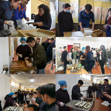 在带队专家讲解下,同学们参观了药王庙,了解安国药市的起源,感受悠久的中医药历史与深厚传统文化底蕴。在安国数字新药都,同学们了解到“互联网+”背景下的数字新药都建设情况及功能设置,领略到对中药产业发展的政策支持及新时代绘就的产业发展宏伟蓝图。在药都国医馆,同学们学习了制作大山楂丸、卷艾条、熬制饴糖、做药香、手工吊蜡等培训课程。在九蒸九晒生产区,大家边听专家介绍,边观察、品尝各个蒸煮炮制阶段的地黄、黄精等,细细体会不同蒸晒批次间的口感变化,感受到古法炮制工艺之精细和继承传统之不易。在中药文化博物馆参观,同学们深深体会到中医药已经融合了安国当地民俗和生活,使安国的“人”与“药”紧紧相连。此外,同学们还来到河北省道地药材种质资源种植区完成了学习。