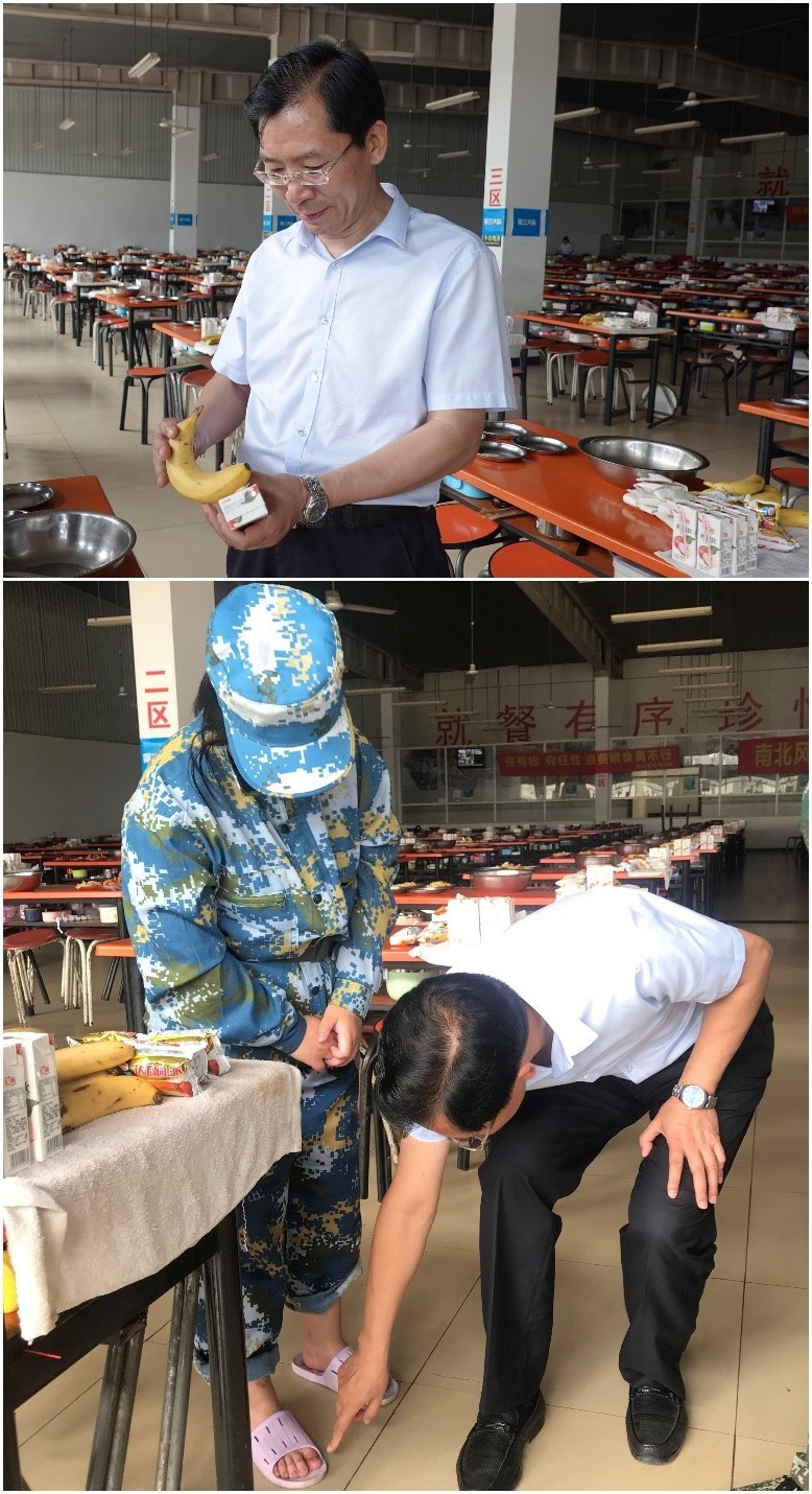 最后,王耀献副校长前往学生食堂检查要为学生发放的月饼、水果、牛奶等中秋慰问品,仔细询问了同学们的饮食与身体情况。对于在军训中受伤的同学,王耀献副校长向他们表达了关心和问候。临别前,王耀献副校长对军训团的训练成果给予了高度评价,对军训基地教官表示感谢。