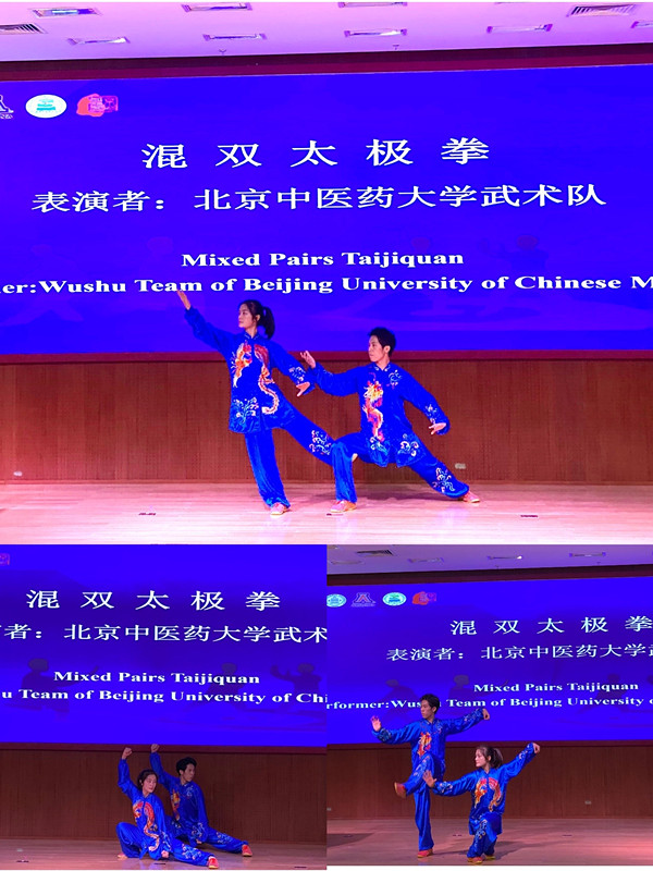 我校高水平武术队教练王帅带领武术队世界太极拳冠军王晓慧、全国太极拳冠军韩以琳两位队员参加了本次大会。并在闭幕式上为大家奉献了一场精彩的混双太极拳展演。节目赏心悦目、精彩生动,得到了在场专家一致好评,同时也让与会专家充分领略到中国传统体育文化的独特魅力。