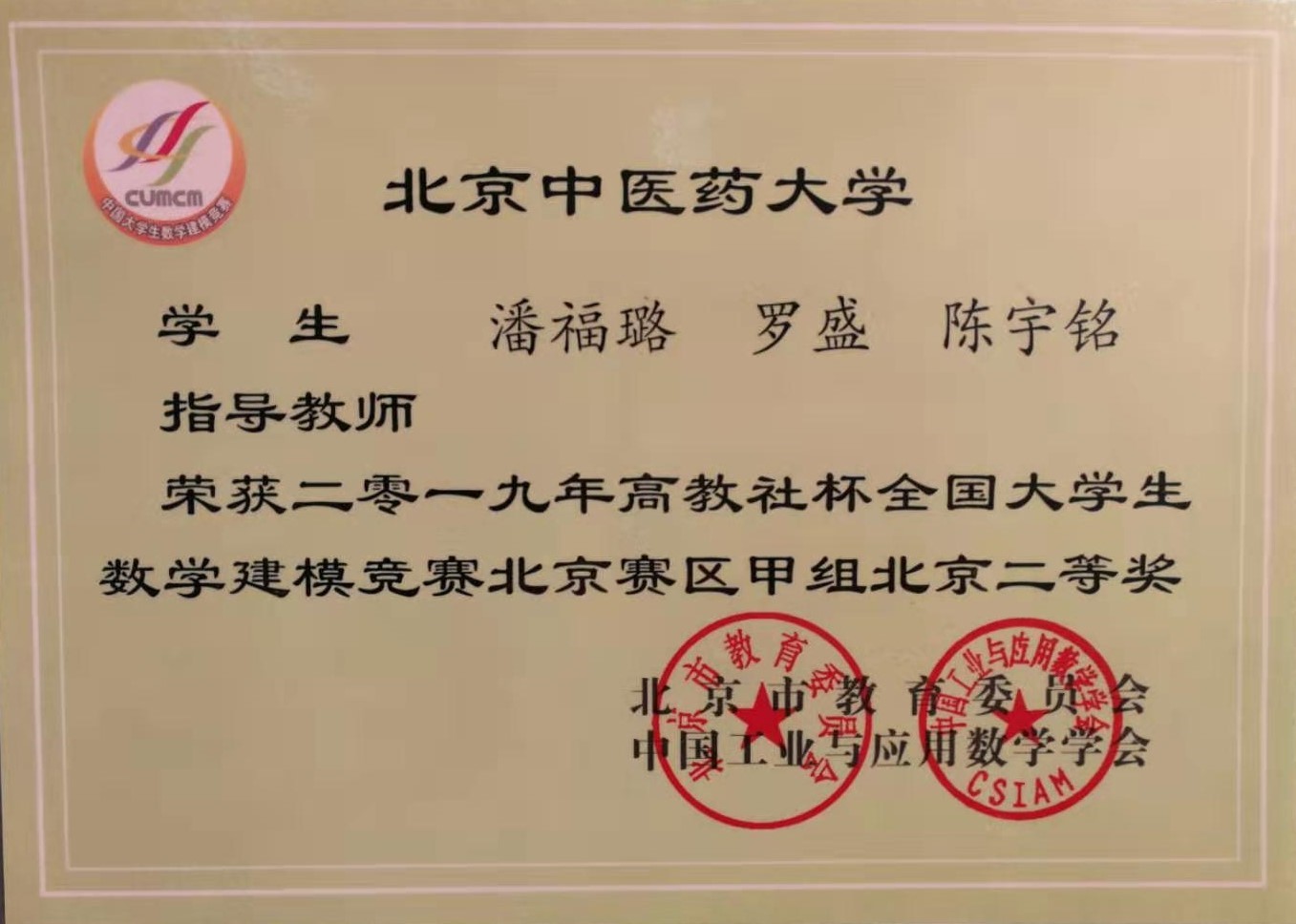 近日,2019年“高教社杯”全国大学生数学建模竞赛成绩揭晓,由我校中药学院数学教研室指导的潘福璐(中药学院)、罗盛(生科院)、陈宇铭(管理学院)荣获2019年全国大学生数学建模竞赛北京赛区二等奖。