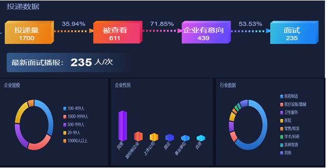 本次双选会于5月11日至13日进行空中集中面试,共邀请全国18个省市地区108家优质用人单位参会,提供涵盖中医学、中西医结合基础、中药学、中药分析护理学等专业岗位500余个,职位数量7000余个。毕业生参与热情高涨,共1622名毕业生报名参加此次双选会,简历投递量达1700余次。其中235人于活动期间与用人单位进行了在线面试。