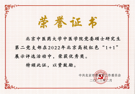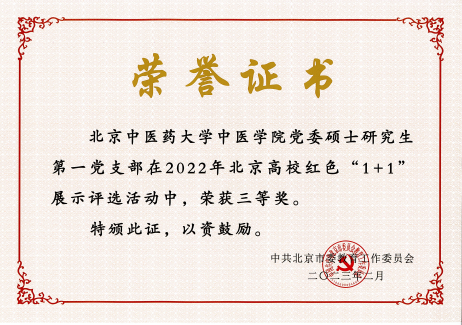 3月7日,由北京市委教育工委主办的2022年北京高校红色“1+1”示范活动结果公布,经由上级评选我校中医学院2个研究生党支部荣获奖项。其中,中医学院党委硕士研究生第一党支部获三等奖,中医学院党委硕士研究生第二党支部获优秀奖。