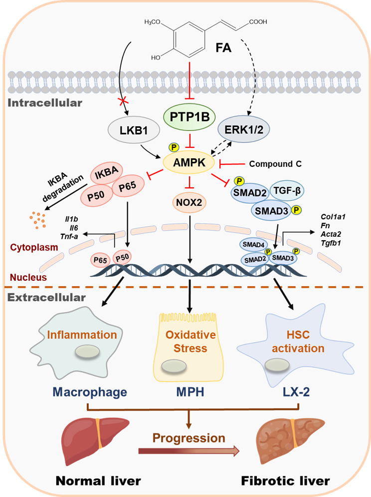 近日,我校生命科学学院李晓骄阳教授在影响因子5.81分的杂志Frontiers in Pharmacology(药理学JCR一区)上以通讯作者,北京中医药大学生命科学学院为第一完成单位发表题为“Ferulic acid ameliorates hepatic inflammation and fibrotic liver injury by inhibiting PTP1B activity and subsequent promoting AMPK phosphorylation(阿魏酸通过抑制蛋白酪氨酸磷酸酶1B活性进而促进AMP依赖的蛋白激酶磷酸化改善炎性肝纤维化)”的学术论文,该研究采用基于分子对接、表面等离子共振及免疫共沉淀等多种分子生物学技术,系统性阐明了中药单体成分阿魏酸对肝脏炎症和纤维化的治疗作用及其潜在机制。该研究为中药天然产物治疗肝脏纤维化和其晚期并发症提供了重要的理论支持。