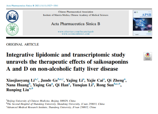 近日,该研究结果以“Integrative lipidomic and transcriptomic study unravels the therapeutic effects of saikosaponins A and D on non-alcoholic fatty liver disease”为题发表在药学中科院一区杂志Acta Pharmaceutica Sinica B。我校中药学院刘闰平教授和山东大学孙蓉教授为该论文共同通讯作者。该研究得到国家自然基金(81773997,82004029)和北京市科技新星(Z201100006820025)等项目的资助。