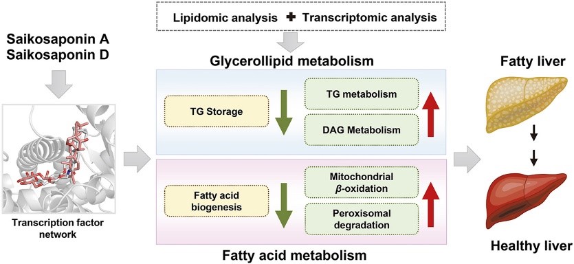 柴胡是“疏肝解郁”要药。我校中药学院刘闰平教授团队与山东大学孙蓉教授团队合作发现柴胡皂苷(Saikosaponin) A和D(SSa,SSd)可能是主要生物活性成分。在前期工作中,合作团队基于蛋白组学研究,发现大剂量柴胡皂苷可在短时间内显著诱导肝脏脂质代谢相关蛋白的丰度变化。这些结果提示柴胡皂苷在药理剂量范围下可能具有一定的脂质调节能力。合作团队基于高脂合并高糖饮食诱导的小鼠模型,发现SSa和SSd均可以显著改善脂肪变性与炎症反应等MAFLD表型,进一步整合运用肝脏转录组学和脂质靶向代谢组学,基本阐明了两种活性成分调节肝脏脂质代谢的作用模式。研究发现,SSa对于甘油三酯和磷脂类脂质合成和降解的作用显著强于SSd;而相比于SSa,SSd可以更加显著地促进过氧化物酶体对超长链脂肪酸的降解作用和CPT1α依赖的脂肪酸β氧化。同时,SSa和SSd均可通过调节SREBP的剪切活化水平,抑制脂肪酸生物合成。以上作用相互协同,最终恢复肝脏脂质稳态,延缓脂肪肝疾病进程。