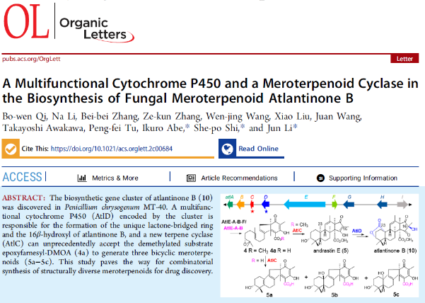 我校中药现代研究中心团队在药用植物内生真菌次生代谢产物Atlantinone B生物合成机制方面的相关研究成果以“A Multifunctional Cytochrome P450 and a Meroterpenoid Cyclase in the Biosynthesis of Fungal Meroterpenoid Atlantinone B”为题在线发表于自然指数期刊Organic Letters。中药现代研究中心博士研究生齐博文为论文第一作者,北京中医药大学李军、史社坡研究员,日本东京大学Ikuro Abe教授为论文通讯作者。