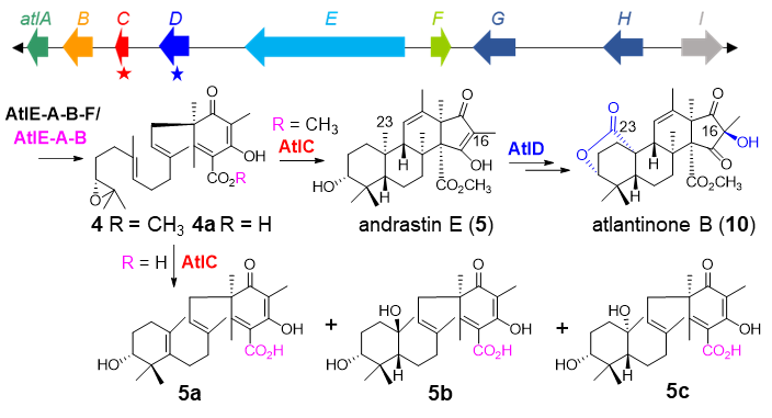 药用植物内生菌与宿主植物的生长、发育密切相关,在体外发酵培养时能够产生大量结构新颖多样的活性代谢产物,是创新药物发现的天然宝藏。对药用植物内生菌进行系统研究,有利于药用植物资源的合理、充分利用。中药现代研究中心团队前期从珍稀药用植物蛇足石杉(Huperzia serrata)内生真菌中分离鉴定出一系列结构新颖、活性显著的代谢产物。在此基础上,中心团队与日本东京大学Ikuro Abe教授合作,结合基因组测序,首次从蛇足石杉的一株内生真菌Penicillium chrysogenum MT-40中发现了负责合成具有独特内酯环结构杂萜类成分atlantinone B的生物合成基因簇atl,在米曲霉(Aspergillus oryzae NSAR1)中重构了atlantinone B的生物合成途径,并鉴定了atl基因簇中各基因编码蛋白的催化功能。研究成果为利用合成生物学手段组合合成结构多样的活性杂萜类分子奠定了基础。