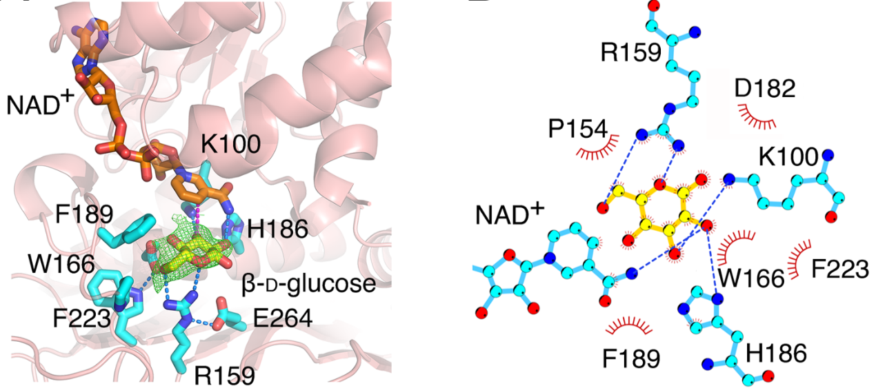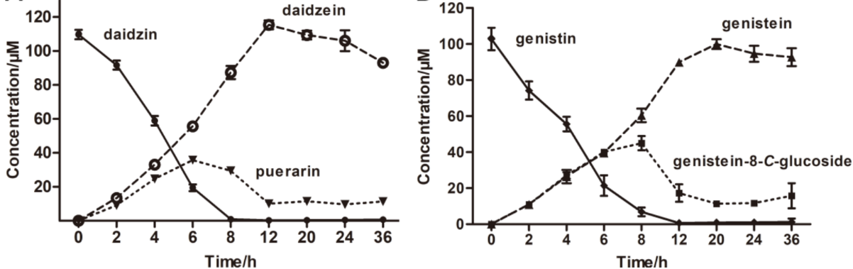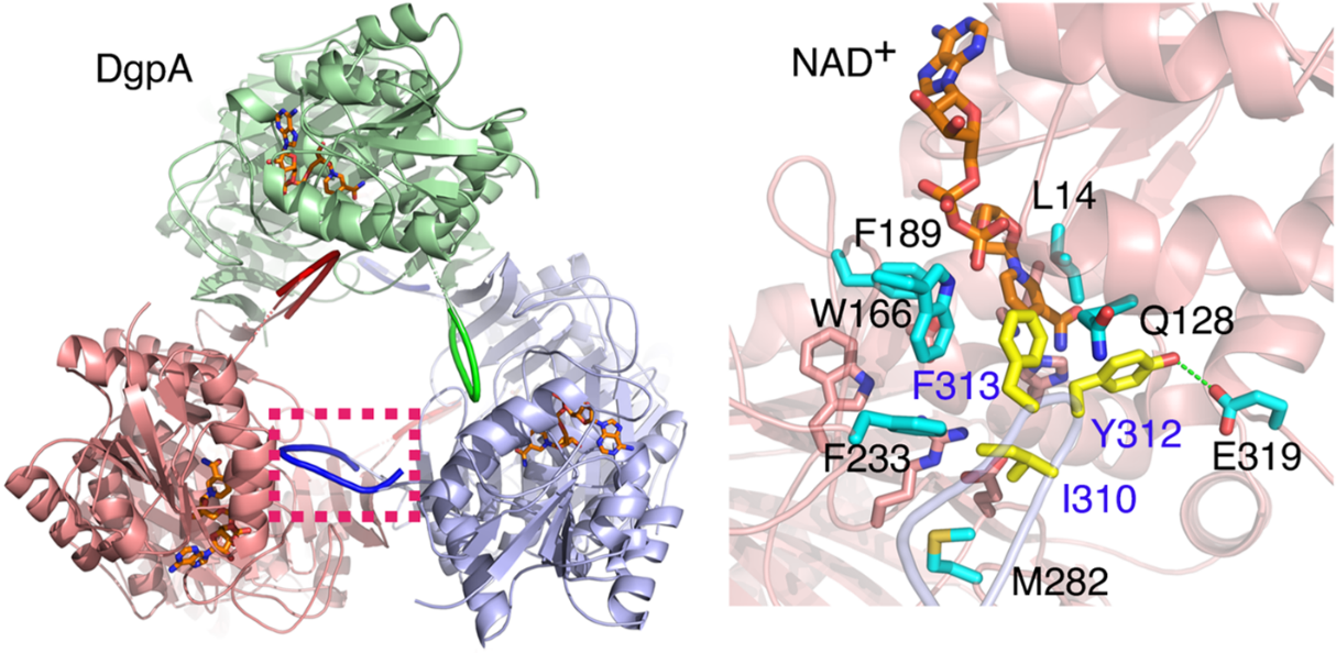 黄酮碳苷类化合物广泛存在于多种中药中,是中药发挥药效的重要成分之一。此类成分包括葛根素、荭草素、牡荆素等的糖基以C-C单键与苷元连接。由于C-糖苷键的特殊稳定性,导致碳苷类中药成分大多难以被代谢。而人源肠道菌PUE分泌的DgpA/B/C蛋白质复合物能够特异性地切割葛根素的C-糖苷键这一过程的分子机理并不明确。我校生命科学学院马文福团队与王如峰团队合作首次解析了DgpA与底物结合的复合物晶体结构,发现了DgpA/B/C既是一类碳苷类裂解酶,同时也是转化氧苷到碳苷类的异构酶。这些发现不仅揭示了酶介导的C-糖苷键断裂机制,而且可为碳苷类化合物的生物合成研究提供新思路。