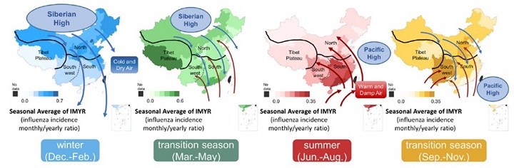 团队应用中国大陆各省份月监测流感数据和月平均气候数据,将中国分为四大地理区域,选取假相当位温、相对湿度、降水和气温快速变化指数4个气候要素建立广义相加模型,评估各因素对不同地理区域流感发病的不同影响,并应用线性回归探讨东亚季风对气候要素和流感发病的影响。结果表明,中国冬季、春季、夏季的流感活跃期分别与东亚冬季风影响下的低温低湿气候、冬夏季风转换下的气温快速变化和夏季风影响下的高相对湿度有关。它们通过增强病原体的存活和传播能力、抑制人体免疫、增加人群接触等途径促进流感暴发。