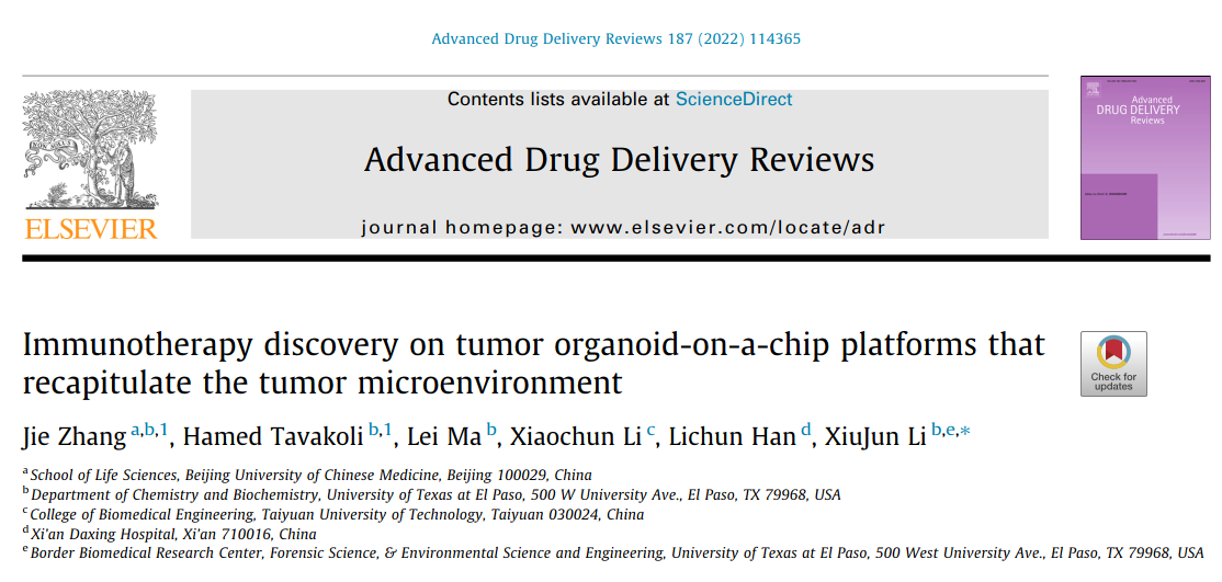近日,我校生命科学学院青年教师张洁在药学权威期刊Advanced Drug Delivery Reviews(JCR药学1区)上发表题为“Immunotherapy discovery on tumor organoid-on-a-chip platforms that recapitulate the tumor microenvironment”的综述。该文系统总结了在微流控平台上模拟肿瘤微环境的各种要素,以及所开展的各种肿瘤免疫疗法的研究进展。生科院青年教师张洁与美国得州大学埃尔帕索分校Hamed Tavakoli为共同第一作者,美国得州大学埃尔帕索分校教授XiuJun Li为通讯作者,我校生命科学学院为第一单位。