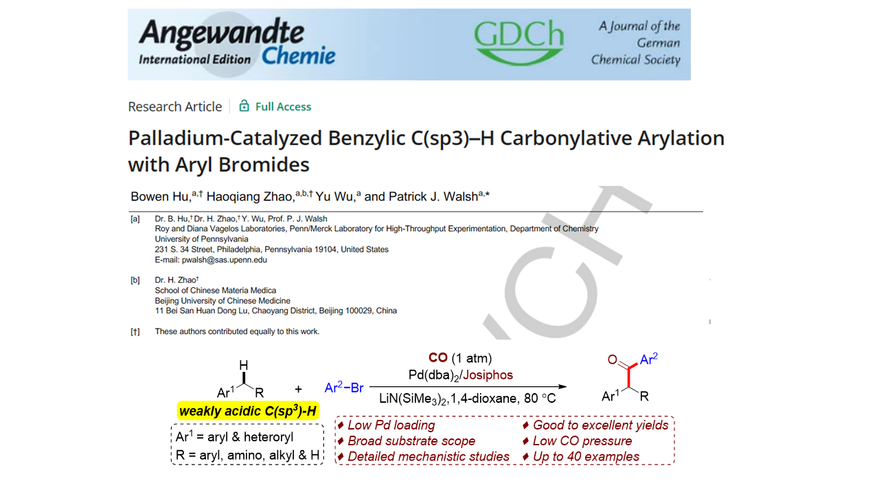 近日,我校中药学院青年教师赵浩强博士与美国宾夕法尼亚大学合作在化学权威学术期刊Angewandte Chemie International Edition(自然指数期刊,中科院一区TOP期刊)上发表题为“Palladium-Catalyzed Benzylic C(sp3)–H Carbonylative Arylation with Aryl Bromides”(https://doi.org/10.1002/anie.202300073)的高水平论文。