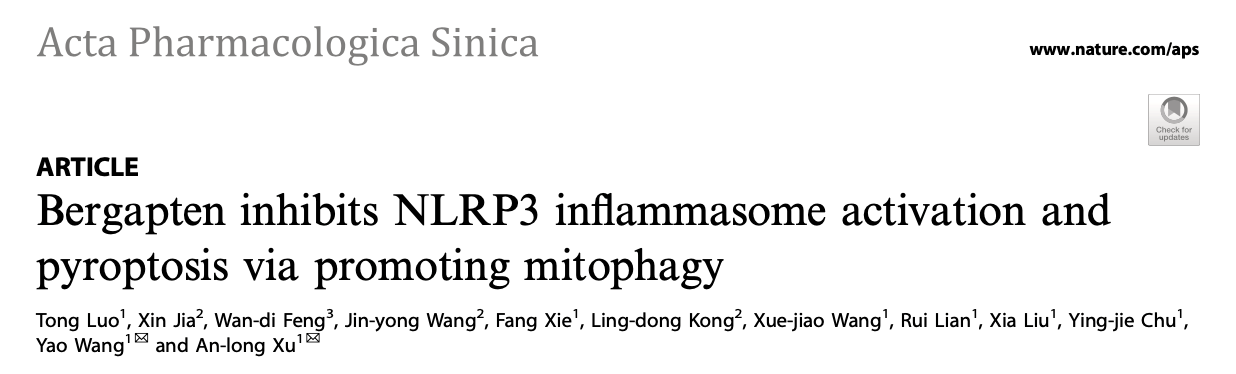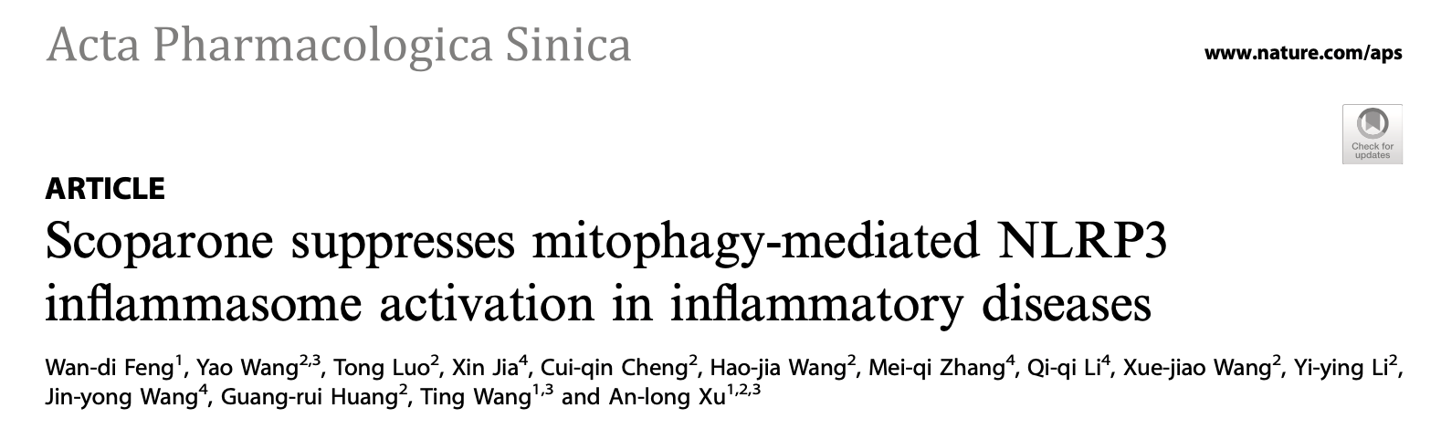 近日,我校生命科学学院徐安龙教授带领团队师生基于NLRP3炎症小体活化筛选模型,分别鉴定出中药内酯类化合物佛手柑内酯(BeG)和滨蒿内酯(Sco)通过促进线粒体自噬、维持炎症激活状态下的线粒体稳态,在病原感染中发挥抗NLRP3炎症小体活化的作用。相关研究成果分别于2023年5月4日及2022年12月15日以“Bergapten inhibits NLRP3 inflammasome activation and pyroptosis via promoting mitophagy”和“Scoparone suppresses mitophagy-mediated NLRP3 inflammasome activation in inflammatory diseases”为题,发表在Acta Pharmacologica Sinica杂志(中科院一区)上。罗彤博士、贾鑫副教授、冯琬迪博士后为共同第一作者,王遥教授和徐安龙教授为共同通讯作者。两项工作从线粒体自噬与NLRP3炎症小体激活角度,共同回答了中药内酯类化合物抗炎免疫的药理机制,为含有内酯结构的中药药理研究提供了思路,为相关药物研发提供了实验数据支持。
