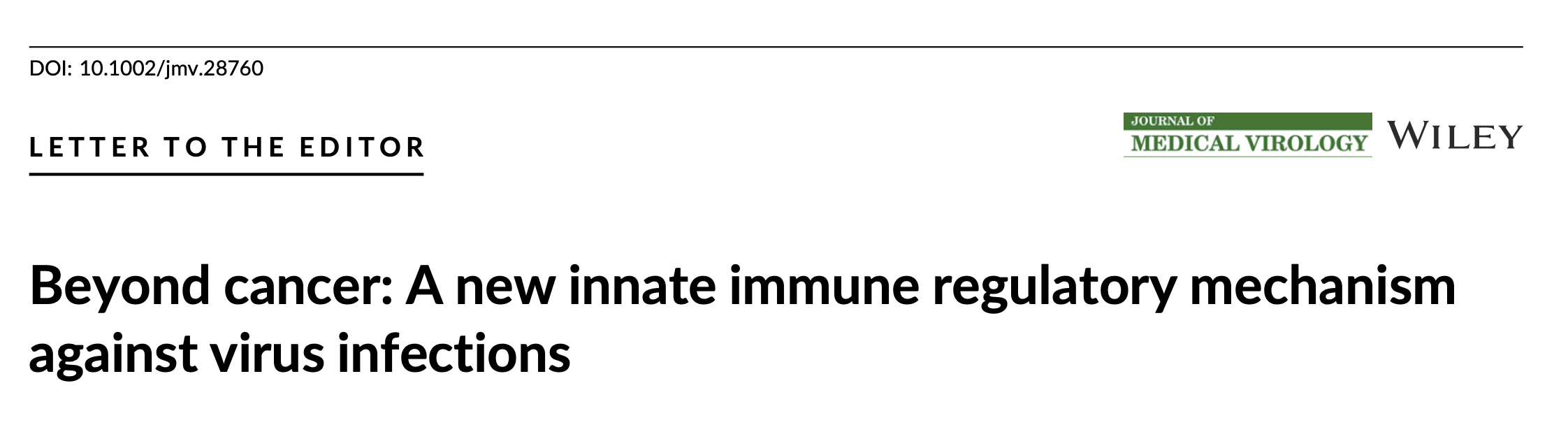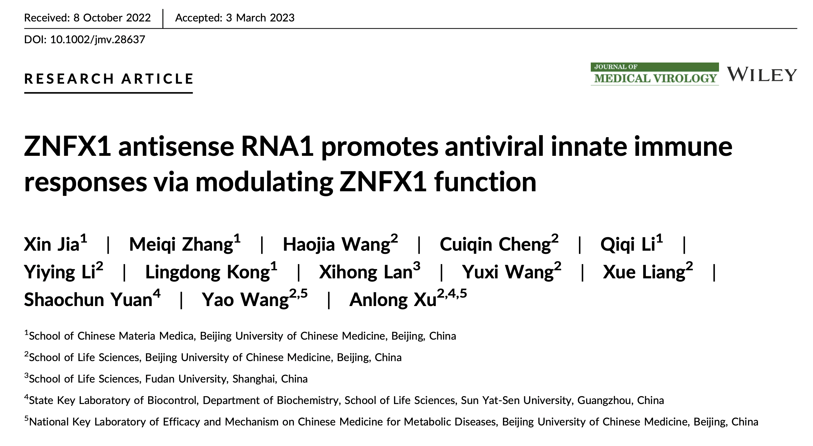 利用生物信息学分析手段,并基于团队2019年发表于Nature Cell Biology的研究工作,团队首次报道了长链非编码RNA (Long noncoding RNAs, lncRNAs) Zfas1通过增强病毒核酸模式识别受体ZNFX1的蛋白稳定性,正向调控宿主的抗病毒天然免疫信号,鉴定了新的抗病毒免疫调控正反馈环路,为lncRNA介导天然免疫调节增加新机理的认识。相关成果于2023年3月3日,发表于Journal of Medical Virology。其中,我校中药学院的贾鑫副教授为论文的第一作者,王遥教授和徐安龙教授为本文的共同通讯作者。此外,美国明尼苏达大学Hinh Ly教授在该杂志同期发表了题为“Beyond cancer: A new innate immune regulatory mechanism against virus infections”的评论文章,对徐安龙教授团队在宿主抗病毒免疫防御领域的研究工作进行了高度评价与综述。