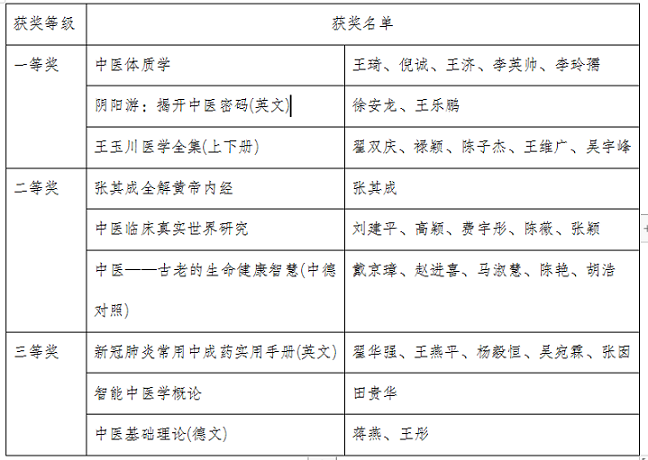 近日,为表彰在中医药著作方面取得重大成就,获得显著社会效益和国际影响力的著作和个人,世界中医药学会联合会发布了《关于世界中联“中医药国际贡献奖--著作奖”奖励的决定》(世界中联发[2023]3号)。我校共获得9项奖励,其中一等奖3项,二等奖3项,三等奖3项。具体获奖名单如下。