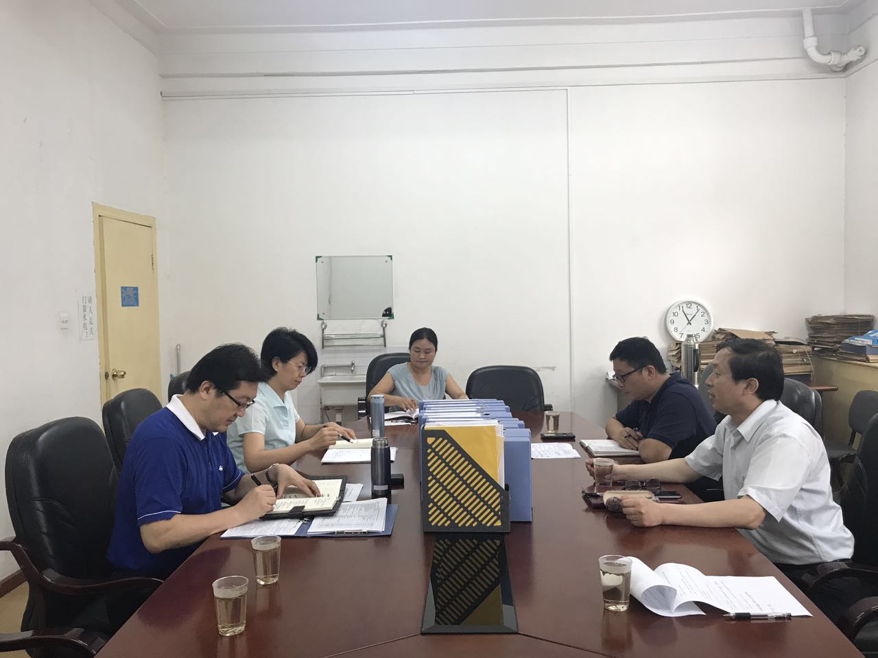王超副部长结合中央文件就学校党委组织部下一步要做的工作进行了说明,解读了《北京高校党建工作和思想政治工作基本标准》中相关任务。关于材料的准备提出了要求和建议,特别是要求支部手册和相关会议记录要完整,党员发展材料要完整等。王超副部长和王潇潇老师认真查阅了学院准备的材料,给了具体详细、可操作的指导。