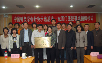与会领导分别作了热情洋溢的讲话,大家充分肯定了针灸标准示范基地的建立对增强东直门医院竞争力和承担社会责任的重要意义,指出针灸标准示范基地在针灸领域享有盛誉,能更好地发挥针灸标准在落实科学发展观、加强针灸事业发展中的技术支撑和保障作用。文碧玲主任宣读了学会授权文件。杨龙会副司长和刘炜宏副秘书长亲自将针灸标准示范基地建设单位的铭牌授予我校东直门医院。仪式结束后,与会的各位领导还亲切看望了东直门医院的医务人员,并合影留念。