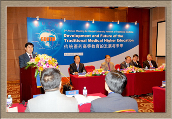 GUNTM大学联盟是2009年5月由北京中医药大学、台湾中国医药大学、广州中医药大学、香港浸会大学、韩国庆熙大学、日本明治国际医疗大学、澳大利亚墨尔本皇家理工大学七所具有地域代表性的传统医药高等院校发起成立的学术联盟。GUNTM着眼于当今世界传统医药教育、科研、临床以及信息交流等领域的前沿,建立起统一协调、优势互补的组织架构。联盟的宗旨是谋求院校间教育、科研、医疗、网络领域的共同提高,进而有力推动传统医药的全球发展。联盟商定每年举办一次会议,本届会议的主题是“传统医药高等教育的发展与未来”。