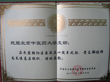 10月中旬,民盟朝阳区委成立十周年庆祝大会在朝阳宾馆隆重召开。北京市人民政府副市长程红,北京市政协副主席、民盟北京市委主委葛剑平,民盟中央副秘书长、组织部部长陈幼平,朝阳区政协主席辛燕琴,民盟北京市委专职副主委刘玉芳、李德胜等领导以及各区、工委党派负责人到会祝贺并宣读了贺词。我校支部7位盟员参加了会议。会上,民盟朝阳区委对12个先进基层组织和39名优秀盟员、16名优秀老盟员进行了表彰。我校民盟支部荣获先进支部称号,方廷钰、卫民、朱文涛及刘玉梅荣获优秀盟员称号。