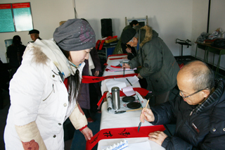 虽然天气寒冷,但同志们热情高涨,义诊服务项目包括中医内科、西医内科、骨科、外科、B超等。老师们仔细查看病情,询问情况,丝毫不马虎。有的老师细致地向村民讲解疾病的发生机理和生活注意事项,宣传保健知识,受到村民的热烈欢迎。校书法协会陈寿泉、陈树宝、史凤歧三位老同志还义务为村民写春联、送福字,村民们争相领取,供不应求。