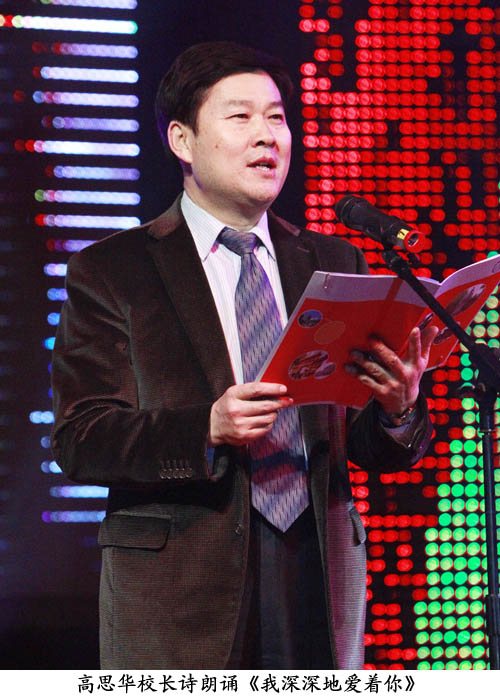 晚会在开场DV秀和精彩的开场舞中缓缓拉开序幕。首先由高思华校长饱含深情地朗诵了他创作的诗歌《我深深地爱着你》(附篇后),感染了全场每一名观众,赢得了多次热烈的掌声。之后来自我校武术队和健美操队的全国冠军,为大家献上了精彩绝伦的武术表演和活力四射的健美操表演;来自台港澳、国际学院的学生代表,来自中国戏曲学院和中央音乐学院的同学们以及晚会特邀嘉宾红樱束打击乐团为现场观众带来了形式多样的绚丽表演。晚会上,学校领导与教师也为同学们表演了精彩纷呈的节目。