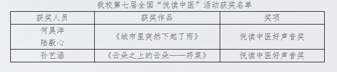 近日,由中华中医药学会、中国中医药出版社等多家单位联合举办的第七届全国“悦读中医”活动结果揭晓。我校荣获“全国‘悦读中医’活动优秀成员单位”称号。同时,我校何昊阳、陆毅心、孙艺涵三名同学的优秀作品在全国征稿中脱颖而出,荣获“悦读中医好声音”奖。