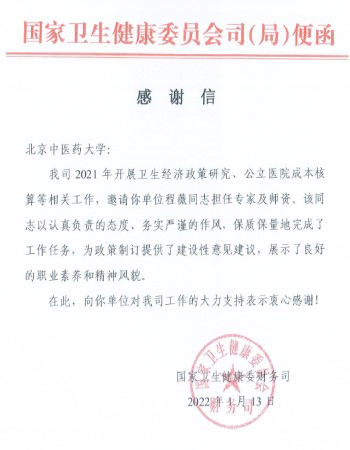 我校管理学院程薇教授收到国家卫生健康委员会感谢信
