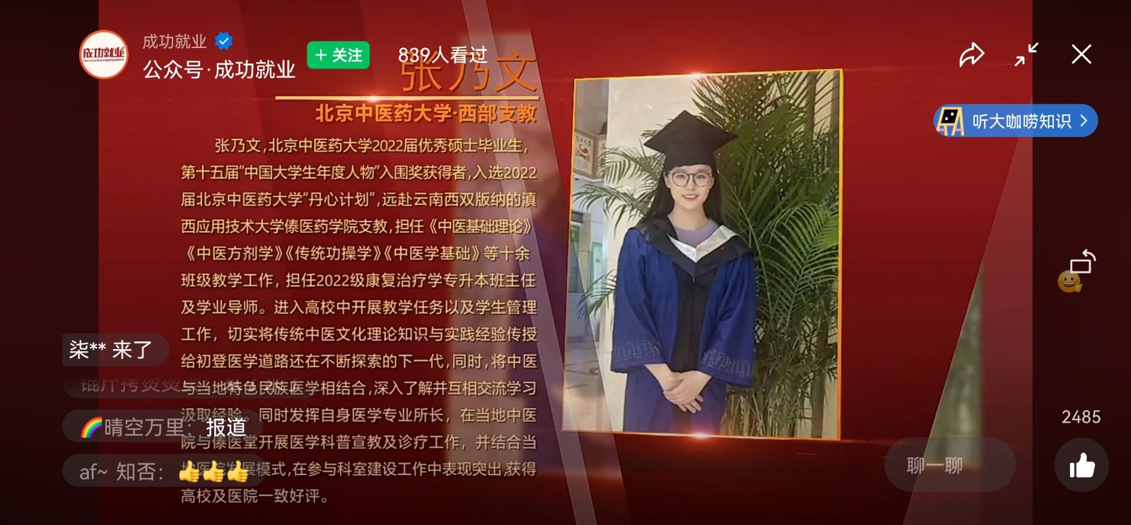 张乃文同学是2022年丹心计划学员,赴云南西双版纳的滇西应用技术大学傣医药学院支教,承担《中医基础理论》《中医方剂学》《传统功操学》等十余门课程教学工作,担任2022级康复治疗学专升本班主任及学业导师。她运用理论知识与临床实践经验相结合的授课方式,为学子们授业解惑,切实将传统中医文化理论知识与实践经验传授给初登医学道路的新生代。同时,她将中医与当地特色民族医学相结合,相互借鉴汲取经验,参加义诊、防疫志愿者等社会服务活动,发挥自身医学专业所长,服务边疆群众。她深入当地县级中医院,定期开展基层医护人员职业能力提升培训讲座,在当地中医院与傣医堂开展医学科普宣教及诊疗工作,并结合当地医院发展模式,参与科室的建设工作。她深刻体会到基层是中医的沃土,感受到边疆地区人民群众对中医学的信任与热衷,同时也拓宽了中医与民族医药相互结合相互促进共同发展的视野,立志要将“永铸丹心,砥砺前行”的宗旨发扬光大。