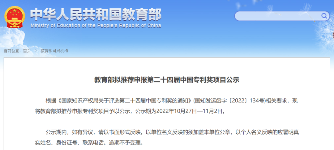 我校入围教育部推选的15所高校申报第二十四届中国专利奖名单