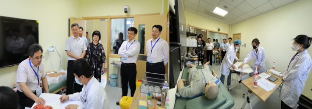 随后,我校姜姗副处长从学校概况、基地建设情况和本年度执医实践技能考试准备情况等多个方面向评审专家组展开汇报。评审专家组在听取汇报后,深入基地各考站、阅卷室、保密室等场所进行实地查看,模拟考试全流程,并查看相关资料与物品准备情况。通过现场考察、查阅资料,专家组对于我校以模拟医院作为全新考试基地的建设成效给予肯定。专家组组长金惠民教授指出,基地制度完善、硬件设施完备,打造了高标准、专业化、国际化、智慧化的多功能考试中心。同时,专家组也对基地建设提出宝贵的意见和建议。