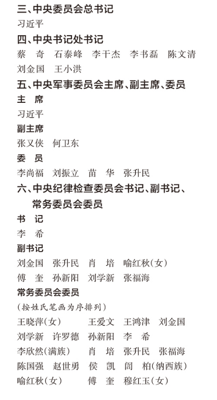 全会选举了中央政治局委员、中央政治局常务委员会委员、中央委员会总书记;根据中央政治局常务委员会的提名,通过了中央书记处成员,决定了中央军事委员会组成人员;批准了二十届中央纪律检查委员会第一次全体会议选举产生的书记、副书记和常务委员会委员人选。名单如下: